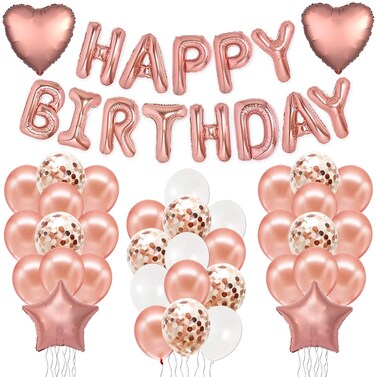 • What will you Get: 1). Happy Birthday Rose Gold Balloons – 2 Strings, Helium Supported, 40 Inch, 16 inch 2). Rose Gold Star Mylar Balloon – Pack of 2, Helium Supported, 18 Inch 3). Rose Gold Heart Mylar Balloons – Pack of 2, Helium Supported, 12 Inch 4.) Rose gold latex Balloons - Pack of 20, 12 Inch 5.) White Latex Balloons - Pack of 5. 12 Inch 6.) Rose Gold Confetti Balloons - Pack of 8, 12 Inch 7). 32 Foot (10 Meters Balloon String), White Color 8). White Straw to inflate foil balloon This Birthday Party Kit is a unique center décor on your cake table, gift, buffet area. Large Happy Birthday Banner Rose Gold Balloons is a perfect size of 16 inches makes it a great eye-magnet.