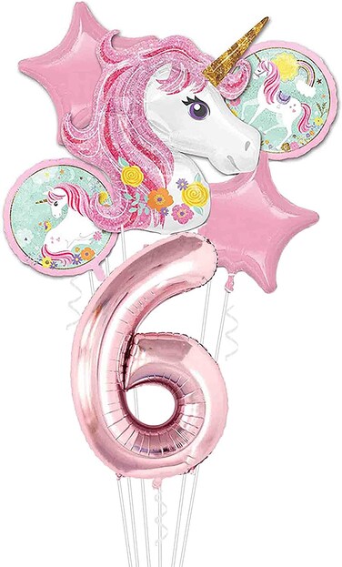 Party Time Pink Unicorn 6th Birthday Balloon Decorations, Foil Balloon Set Pack of 6 - Number 6 Rose Gold Number Foil Balloon 40" Unicorn Theme 6th Birthday Decoration Supplies