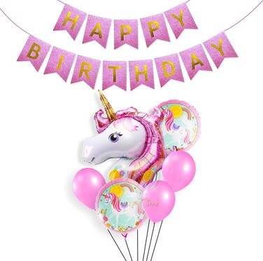 Party Time Pink Unicorn Theme Birthday Decorations Set Pack of 7 - Pink Glittery Happy Birthday Banner with 6pcs Unicorn Latex and Foil Balloons, Unicorn Decorations Party Supplies