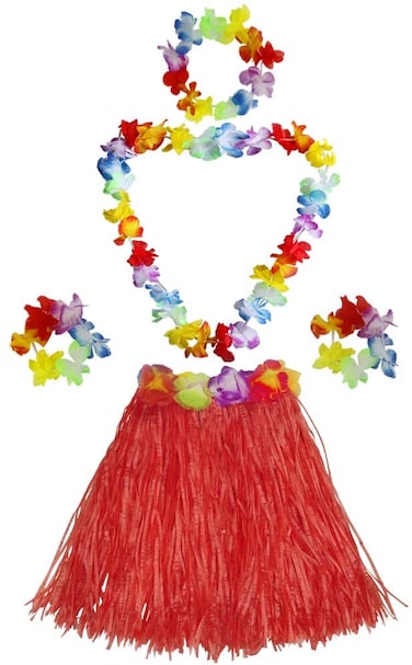Party Time Red Hula Grass Skirts Elastic Girls Children Womens Hawaiian Hibiscus Flower Dancer Dress Favors For Party Decoration Supplies Performance Bracelets, Headband, Necklace Costume Set, 1 Set