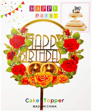 - PRODUCT DETAILS: This high-quality red & gold round shape happy birthday cake topper with rose design will make your cake look perfect. The cake decoration tool is made of high-quality acrylic material, non-toxic and tasteless, and has no effect on the cake itself.