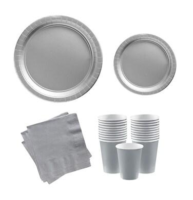 Party Time Serves 48 Guest Complete Party Pack Silver 9" Dinner Paper Plates , 7" Dessert Paper Plates, 9 oz Cups, 2 Ply Napkins - office parties, summer picnics, birthday party set, festivals, Silver
