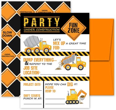START YOUR PARTY OFF RIGHT- Every great party starts with the invitation. Your guests will look forward to your special event with these fun themed invites. SUPERIOR QUALITY- Double Sided Design, Professionally Printed in the USA on Thick, Eco-friendly, Recycled Matte Cardstock with matching orange envelopes. LARGER 5" x 7" SIZE- Allows plenty of room for important party information. PERFECT CHOICE FOR - Your Construction, Bob the Builder, Dump Truck, or Big Truck Themed Party. Flat fill-in cards are uncoated on both sides for ease of writing with pens or pencils.