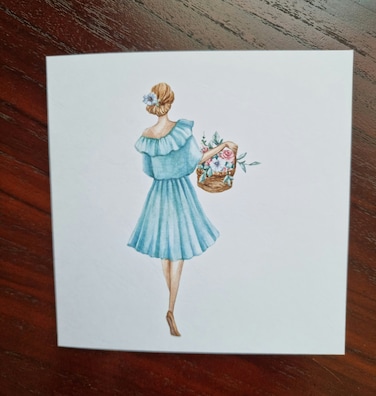 Pretty lady in a blue dress with a basket of flower. This lovely note card is perfect for any occasion and can be personalised upon request.