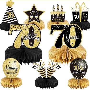 Package: you will get 9 pieces of birthday honeycomb centerpieces including stars, cake, balloons, and so on,These 70th table decorations are so chic and funny that make your birthday theme party a big hit.