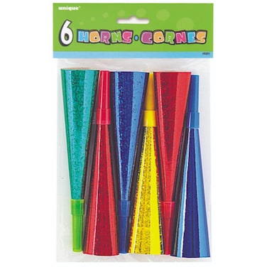 - These colorful Prism Horns will liven up any party. These fun noisemakers are perfect for New Year's Eve, surprise parties, birthday parties and more. Each pack includes 6 assorted color, shiny Prism Horns. No New Year's celebration is complete without Prism Horns. Combine with other fun New Year's Ever party supplies and accessories from Unique. Prism Horns come 6 to a pack and measure 8" long.