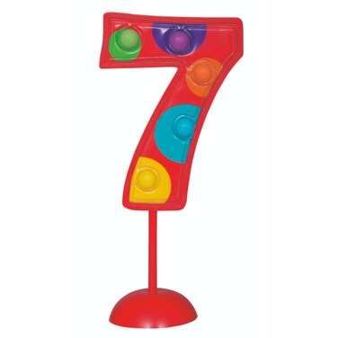 - This Flashing Number 7 Cake Decoration will bring a wow factor to your party! The colorful circles will flash colors in three different modes on this blue Flashing Number 0 Cake Decoration. Measures 8" high x 3" wide Made of plastic On/off button Batteries included