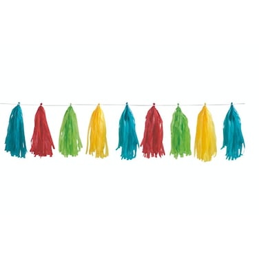 • 1 Plastic Rainbow Tassel Garland. Rainbow party garland measures approximately 9ft (2.74m) in length. Adds bright colour to a kids birthday party, rainbow party, New Years Eve party, circus theme party and more. Drape across a party table, mantelpiece, archway, or on a wall for easy decorative flair