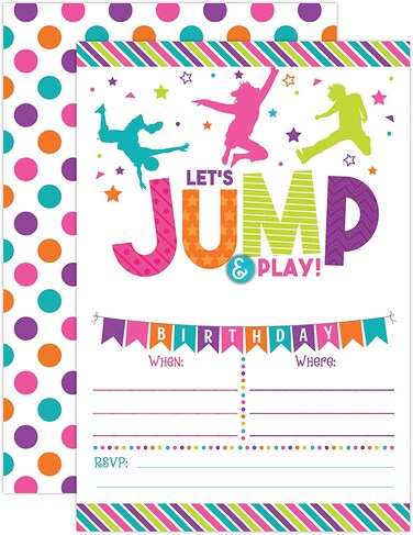 Handwrite your event details in the spaces provided, and invite your guests with these matte premium fill in party birthday invitations. These colorful invitations are perfect for your bounce birthday party! Professionally printed on premium heavy weight cardstock and designed and printed exclusively by Your Main Event Prints in the USA.