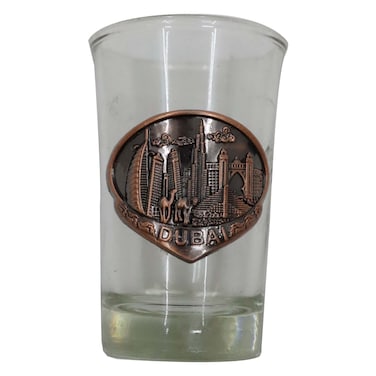 It features a clear glass body with a copper-coloured engraved design of the iconic Dubai city skyline. The short size makes it perfect for serving cocktails or other beverages.