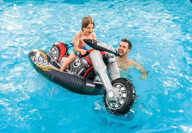 - Bring the thrills of the open road to the poolside with the Intex Cruiser Motorcycle Inflatable Ride-On Pool Float. This motorcycle pool float ride-on is designed so your kid can ride it like a real low ride cruiser. It has an extra-wide base for extra stability. It is built with durable 12-gauge vinyl, includes 2 heavy-duty handles and 4 heavy-duty air chambers for safety. Dimensions 71in L x 37in x 28in H. Built with 14ga vinyl. 4 air chambers. Sleek low riding cruiser design. Wide base for extra stability. 2 heavy duty handles. 220 lb max weight limit. Age grading 3+
