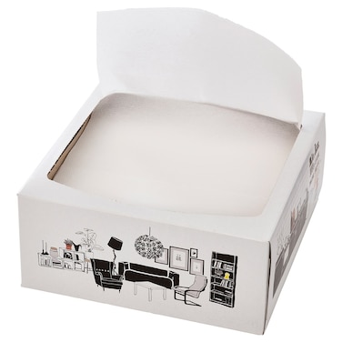 - These napkins come in a box decorated with IKEA icons. The napkins are pratical to use throughout the home and on car trips or picnics.Two-ply paper with high absorbency means less materials are used.