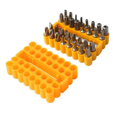 - Contains: 1pc 1/4"x60mm magnetic bit holder 32 Cr-V 1/4"x25mm bits: 9pcs Torx with hole: T8, T10, T15, T20, T25, T27, T30, T35, T40 6pcs Hex with hole: H2, H2.5, H3, H4, H5, H6 6pcs Hex with hole SAE: H5/64, H3/32, H7/64, H1/8, H9/64, H5/32 3pcs X type: 6, 8, 10 4pcs Y type: 1, 2, 3, 4 4pcs Slot with hole: 4, 6, 8, 10 Packing: plastic case with double blister