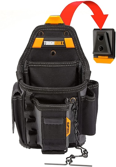 Product Description: The ToughBuilt Small Electrician Pouch transforms how professional electricians carry their tools. The patented ClipTech Hub allows this pouch to clip on and off any belt. And the integrated kickstand allows it to stand upright on the ground close at hand. This pouch is designed for the ever-changing needs of the professional electrician. Made specifically for an electrician's tools, its 13 pockets and loops include a wire-r pocket, adjustable tool pocket, notebook pocket, tape chain, and 2 screwdriver loops. With rugged 6-Layer Construction and heavy-duty rivet reinforcement, this reliable pouch withstands the most rigorous working conditions. Set Contains: Small Electricians Pouch