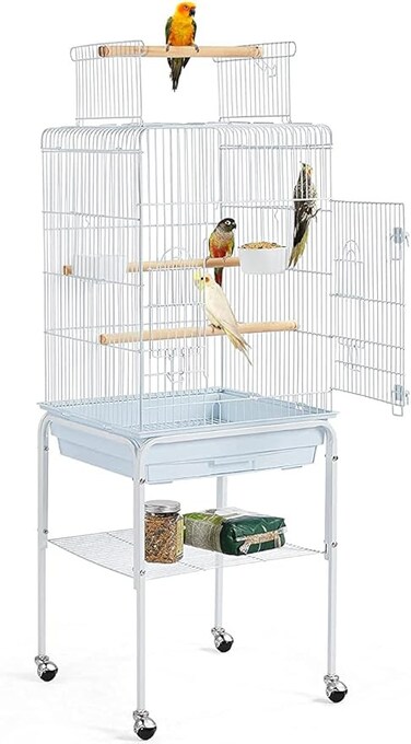 Features Made of high quality material, sturdy and durable to use Fashionable design makes it very chic and popular 3 oversized doors located at the front for easy access to the inside area Features with 2 food containers, 2 wooden perches and 1 metal handle 4 wheels ensure flexible and safe movement Bottom tray is removable, very easy to clean Metal handle makes it portable, so you can take it with you wherever you go Pet-friendly design ensures birds don't get caught on or stuck in-between openings Perfect as a house for birds such as the finch, parrot, cockatiel and so on Description: Make cleaning a breeze: To ensure good user experience for pet parents as well, this cage has slide-out tray for collecting bird droppings and easy cleaning Interactive play top: To keep your bird stimulated and provide both you and your feathery friends with a better interaction way, we upgraded this 47-inch bird cage by adding an easy-to-use play top. It includes a perch that keeps the top doors open for the birds to stand on, and can be closed to give them a safe enclosed home. Solid construction: Crafted from quality metal wires covered with non-toxic rust-resistant paint, our bird cage is a strong metal structure with an easy-to-clean plastic base, and two sanded wooden perches for the birds to play Extra accessory storage: Another thoughtful design for pet parents is the extra storage shelf on the stand. It can keep bird cage cleaning tools, bird seeds and toys handy and neat. Detachable rolling stand: This rolling bird cage sits on four 360-degree swivel ball-shaped wheels, making it effortless to move around. The upper cage can be used separately thanks to the detachable design. You can place/carry the cage without the stand at will. Perfect for small birds: This cage measures 18.5inch long, 18.5inch wide and 28inch high. The decent size of this cage provides plenty of living space and room for activity to small birds like canary, cockatiel, lovebirds, etc.