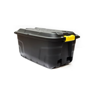 • This heavy-duty plastic storage trunk with lid is extremely robust and perfect for bulk storage. The lid is secured with strong clip locks which ensure a secure fit and the contents of the box can be made even more secure by putting a padlock through the two holes at either end of the box. With four large wheels it's also very easy to move, even when full. With a huge 75L capacity it is suitable for all sorts of uses. • Clip-on lids. • Mounted on wheels for easy maneuverability. • Color: Black • Storage capacity 75 litre. • Dimension: 77L x 42W x 40H cm • Weight 3.4kg. • Made in the UK