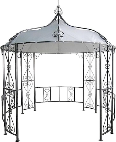 The party tent has a sturdy iron construction with beautiful, decorative details and a polyester roof.