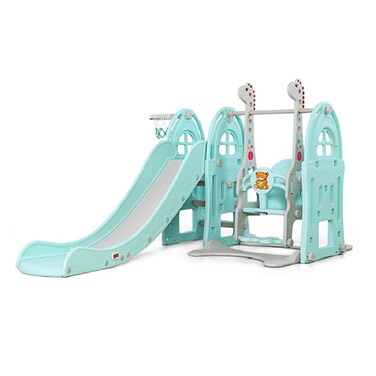 - The cute giraffe shape swing can immediately attract children's attention,and the height of swing can be adjusted according to your needs. The super long slide includes an acceleration zone, a deceleration zone, and an extended buffer zone,provide safe sliding for children.The basketball hoop for kids to shoot, which increases the fun of play and develops the kids' athletic ability. The 3-in-1 multi-functional set made of safe and durable PE material, it is not easy to wear and deform, allowing kids to play without worry.Create an exclusive amusement park for your baby.