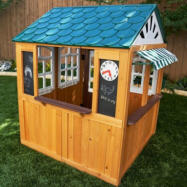The coastal cottage playhouse by kidkraft is built to inspire imaginative play in a beautiful house that's full of fun and excitement. Kids will love playing for hours in this house packed with exciting details like a working doorbell, a clock with moveable hands and a functional mailbox. Little ones will be delighted as they walk through the front door and enter the playhouse with decorative windows. Featuring large serving windows with a café style canopy, two chalkboards to display the menu of the day and a cute planter box, the coastal cottage creates the ultimate fun and beautiful destination for kids. Built with 100% cedar lumber and treated with a child friendly water based stain, this coastal inspired playhouse is made with good quality materials and designed to be aesthetically beautiful so little ones can have big fun in their backyard for years to come. With ez kraft assembly, spend less time assembling and enjoy more time playing.