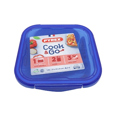 Pyrex Cook & Go Square Dish With Lid Blue And Clear 1.9L