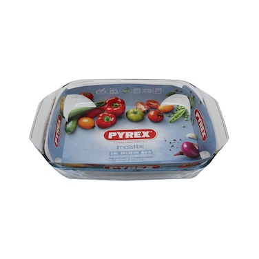 The Pyrex Optimum Glass Rectangular Roaster is a clear, 3.8L capacity dish perfect for roasting meats and vegetables.