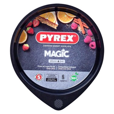 The Pyrex Magic Non-Stick Cake Pan is a versatile and durable baking pan that measures 20cm in diameter. It features a non-stick surface that ensures easy release of baked goods and effortless cleaning.