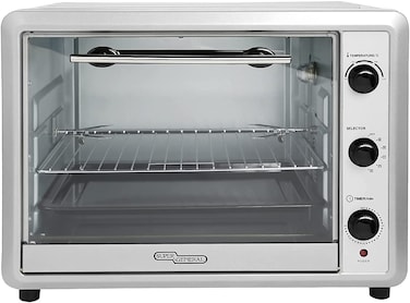【The Electric Oven】Become your own Chef and enjoy professional and efficient cooking and grilling at the comfort of your home with this compact Electric Convection-Oven-Grill from Super General. Made from high-quality stainless-steel, durable, easy to clean, low maintenance. With a large capacity of 60 liter, this Oven is the ideal kitchen-machine for single- and family-households. Juicy chicken or slow-cook roasts - the adjustable temperature up to 250 degrees ensures cooking to perfection! The Features】Practical and efficient, this oven-grill comes with rotisserie, convection-function, 60 minutes timer, 60 liter capacity, indicator light and Illuminated chamber, internal lights for easy visibility and convenience. Maximum 6 stages switch heating-selector, 4 stainless-steel heating elements and temperature-control with easy-to-operate twist knobs ensures ease of cooking. One wire shelf and bake tray are included to prepare delicious meats, fish or delicious desserts and pastries! 【Elegant Design】Versatile and robust, this compact Oven with cycling airflow makes cooking, grilling and baking easy. Stainless-steel glossy silver finish, three black knobs and a large silver handle of 30cm length, power lamp below knobs in red and durable glass door make this professional kitchen-cooker a highlight in any kitchen. 2000W power ensure that dishes are prepared quickly and on-point. Four feet of 3 cm width ensure stability & safety. With a long, 85 cm cable for flexibility.