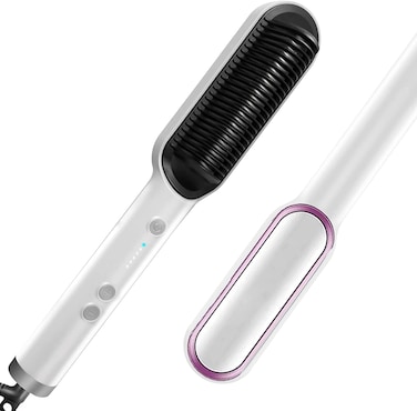 Our engineer team have spent nearly half a year to develop the new type straightening brush. This ionic technology will give you silky smooth and professional-looking straight hair in just a few minutes. EASY TO USE The 2 in 1 hair straightener is simple and easy to operate. Perfect for daily care, help you straighten hair quickly and easily solve the problem of hair knotting, which is convenient for home and travel. HEATING MODES The straightening brush use PTC ceramic heating device, which can be heated quickly and save more time for you. Different heating positions are suitable for different hair types. ANION HAIR CARE Upgraded ion technology locks the water in the hair, releases a large amount of anions and smoothes your hair, make it naturally shiny and reduce split ends and knots, make your hair natural and healthy. ANTI-SCALDING DESIGN The hot comb hair straightener is light, easy to carry use. The LED display show different modes for you to control the temperature. The hair brush straightener use U-shaped anti-scalding design and protect you in all aspects. EASY TO STORE Long power cord allows you to swing freely and keep charge at all times. The hair straightener comb can be safely hung upside down on the wall, which is convenient for you to use every day and keep in a smooth state. UPGRADED VERSION The 27-tooth comb design is equivalent to 26 electric clipboards working at the same time. In order to avoid accidental shutdown during use, our hair straightener brush has been upgraded to a new sink button design.