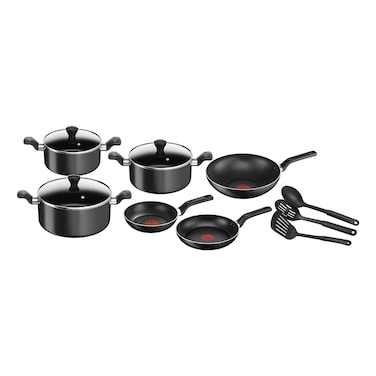 The Tefal G6 Super Cook Non-Stick Cooking Set in Black includes 12 pieces of high-quality cookware.