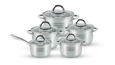 Royalford 10Pcs Stainless Steel Cookware Set, RF10390 - Induction Compatible Base, Dishwasher-Safe, Strong, Heavy-Duty Riveted Handles
