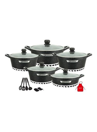 Dessini 17-Pieces Granite Cookware Set Includes Casserole With Lid 24cm, Casserole With Lid 28cm, Casserole With Lid 32cm, Casserole With Lid 28cm, Shallow Casserole 7Xcooking Tools, Black/Clear 32cm