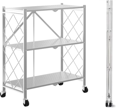 【Perfect Size】Open size. 28 x 13.8 x 34.6"The height on each layer not only creat more additional space but also keep your home clean and orderly. Folded size.3.9 x14.3 x34.6". The shelf can be stored under bed, in a narrow closets, behind doorways and so on, It will not take up more space when not in use.