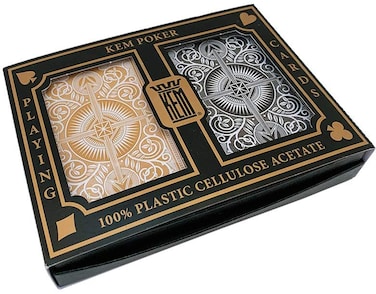 KEM Plastic Playing Cards is a 60-year-old company specializing in one product—playing cards which are 100% cellulose acetate plastic. KEM plastic playing cards contain no vinyl, which is the raw material used by all other playing card manufacturers for their "plastic" playing cards.A set-up consists of one black deck and one gold deck. The cards come in a hard black plastic KEM box. One joker is present with each deck. The dimensions of the cards are Height: 3.88”, Width: 5.56”, Depth: 1.00(Poker Size) KEM cards can handle the wear and tear like no other brand of card in the industry. KEM’s high performance cards will last longer, shuffle better, and deal in such a manner that you will never want to play with anything else again.