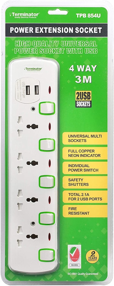 Terminator Power Extension 4 Socket 2 USB Charging Ports with 3 Meter Cable -TPB 854U