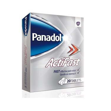 - Panadol ActiFast Tablets is a new generation pain reliever containing 500 mg paracetamol and 173 mg sodium in each tablet which is absorbed twice as fast as regular paracetamol. Panadol ActiFast provides fast, effective relief of pain associated with headaches including migraine, muscular aches and pains, joint pain, period pain, toothaches and sore throat.