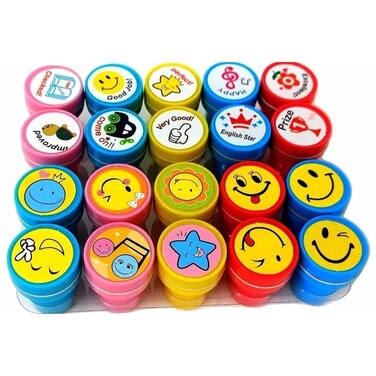 CRAFT MAGIC 20 piece stamps for kids 10 emoji and 10 motivation reward pencil top stamp.
