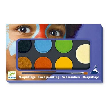 This Djeco Face Paint Kit contains 6 2ml palettes in yellow, orange, blue, purple, green and brown, plus a sponge and a paintbrush.