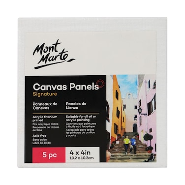 Mont Marte Signature Canvas Panels offer an inexpensive painting support with the look of painting on canvas. Panels provide a sturdy, non-flexible surface and are great for painting outdoors as they are compact and easily transported. Canvas panels are also less prone to damage than stretched canvases. Because of their sturdy construction they are also fantastic for collage techniques. Acrylic titanium primed and ready to be painted on, these panels are suited for use by students through to professionals.