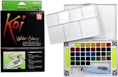 - <p>Refillable 9Ml water brush to transport & store water<p>Detachable easel that secures to kit in the center, right or left hand sides<p>Snap lid that acts as an easel for paper (5"x7" paper size)<p>Pull-down finger ring on the base for easy grip<p>Half pan watercolors, formulated to blend easily & create an endless range of colors<p>25.1 x 3.18 x 14.45 cm, 408.23 Grams<p>Size:36 Color Set<p>Style Name:Koi Water Color Field Sketch Set<p>Capturing the moment just got easier with Koi water color field sketch kits. This portable watercolor set is perfect to bring along whether you're going to the countryside, relaxing at the beach or walking urban landscapes. The kit is lightweight and affordable. Half pan watercolors, formulated to blend easily and create and an endless range of colors. The small, sleek kit design fits into backpacks, making it perfect for painting on the go. Koi water color field sketch kits have the ACMI AP seal of approval. Koi water color field sketch sets are recommended for ages 14 & over. Includes a refillable Koi water brush to transport and store water. The water brush technical qualities are polypropylene, transparent barrel and nib holder section, nylon fibers for brush tip, please keep cap and plug away from small children. Set consists of 36 half pan watercolors.