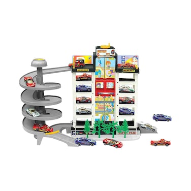 It features a large garage with multiple levels and ramps for the cars to race down. The set includes four brightly coloured cars that can be launched from the top of the garage and race down the ramps.