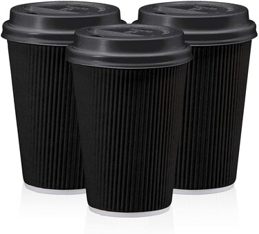 • <p>PACKAGE INCLUDES- 50 pack of black disposable coffee cups with lid. Each cup can hold up to 12 fluid ounces<p>MULTI-PURPOSE CUPS- All-purpose hot paper coffee cups that are perfect for both hot or cold drinks. Perfect for festive occasions such as bridal showers, baby showers, birthday parties, weddings, and even everyday use, great for restaurants, cafes, and shops<p>PREMIUM QUALITY- Our paper cups with lid are made of high food grade paper to be extra thick and sturdy to ensure they are durable and lasts through multiple refills<p>LEAKPROOF- The compatible lids snap on easily and are leakproof, great for on-the-go or while running errands<p>ECO-FRIENDLY- Our disposable paper cups are recyclable, reusable and environmentally responsible<p>Product Dimensions: <p>Product Description:<p>Size:12 oz.MARKQ black disposable coffee cups with lids are an ideal solution. Unlike a smooth surface cup, this cup is designed with a ripple effect that works as an insulator which does not let the heat pass through the walls on the outside of the cup, and makes it easier for the consumers to hold it without having to need for a cup sleeve. These cups are made with rolled rims for extra strength and sturdiness - ensuring a tight lid fit while also stopping the cups from flexing in the hand. This will reduce the risk of any leaks, spills or burns when customers are enjoying their coffee, soups or any hot or cold beverage. The perfect and safe solution for cafes, coffee shops, kiosks, bistros, festive events, drinks to-go and even everyday use. With a stylish ripple design these not only perform well but look stylish and modern also. Key Features: Thick triple wall insulated cups Compostable and Recyclable material Stylish black design Includes secure lids to keep your drink from spilling when you walk around or drive around in the car Triple insulated so no need for a cup sleeve Extra layer of rippled insulation keeps drinks warm, provides superior grip, and prevents hands from burning <p>Specification: Brand name: MARKQ Cup size: 12-ounce <p>Package Included: 50 Pack of black ripple cups with lids Material: Paper Design: Ripple Colour: Black Made in: UAE <p>Disclaimer: Despite every effort to provide accurate images of each product's color and size, actual color and size may vary slightly due to different device screen settings, the lighting in the installation location, slight differences in product finishes over time, and other factors.