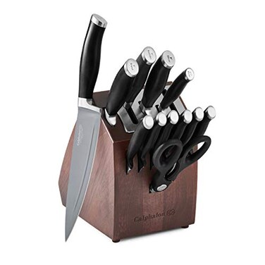 Tired of food always sticking to your knife while you cut? The Calphalon contemporary sharp in nonstick 13 piece cutlery set is a line of premium cutlery that features a uniquely designed nonstick-coated blade with a longitudinal ridge that prevents food from sticking-making food prep easier and saving you time.