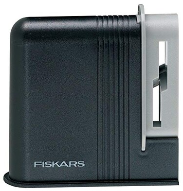 Fiskars 9600b33 Scissor SharpenerFiskars scissor sharpener is an essential tool to restore and maintain the cutting edge of scissors.How to use:-On a flat surface grip the scissor sharpener in one hand, insert the scissors blades into the slots and work the scissors forward and backwards three or four times.After sharpening, wipe your scissor blades carefully to remove any metal dust.