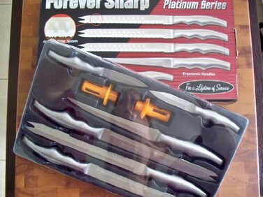 Platinum Series Knives 8 pc Price: $51.00 The same great Forever Sharp knives with sleek, all-metal handles for the gourmet kitchen! Each set contains: 3 three of our famous Forever Sharp knives 1 multi-purpose filet knife 2 essential paring knives And 2 Juice Extractors from Florida. The Forever Sharp is a carving knife, a bread knife, a frozen food knife. Truly multi-purpose. It will be this sharp today, tomorrow, next week, next year- ten years from now guaranteed in writing: If any of our Forever Sharp Knives should ever become damaged, even if it is your fault, TT Trading will send you a replacement absolutely free. Simply enclose a check in the amount of $2.00 to cover postage along with your product in its original packaging. If you do not have the original packaging, please be sure to wrap the product well before shipping. For information on where to mail the product, please visit the contact us page.