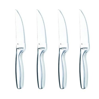 Amazon.com A smart addition to just about any contemporary flatware set, the Gourmet Settings steak knives combine modern looks with old-fashioned functionality. Crafted from premium stainless steel with heat-forged blades, each knife has a hollow handle for comfort and maneuverability. The grip is contoured and generous with a protective bolster at the transition from handle to blade. Arced for an ideal cutting angle, the blade has a finely tapered tip and extra-sharp, long-lasting serration to minimize tearing. A lustrous matte surface completes the design. Packaged in a set of four, the knives are safe in the dishwasher or easily hand-washed and carry Gourmet Settings' warranty of 50 years. --Emily Bedard Product Description GOURMET SETTINGS At Gourmet Settings we are obsessed with design. We are constantly refining our flatware sets to ensure elite ergonomic integrity, timeless design, and a beautiful finish suitable for any occasion. All Gourmet Settings patterns have been meticulously designed, engineered and tested to be perfectly weighted and balanced, ensuring optimal performance and comfort you have to feel to believe. Our silverware sets are made with premium stainless steel and are to last for years to come. Every time you pick up your fork we want to bring a little smile to your face! QUALITY: Unique stainless steel flatware sets focused on best design and size variety for comfort and performance. FINISH: This elegant matte finish steak knives set maintains it's finish perfectly without need for additional polishing and has been built for both strength and luster. SUITABILITY: Suited to everyday casual or formal dining occasions as well as alongside any existing sets and tableware. WHAT'S INCLUDED?4 x Steak KnivesLength = 9 1/4"