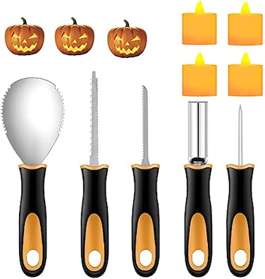 Halloween Pumpkin Carving Kit, 5Pieces Heavy Duty Professional Stainless Steel Carving Tools Set for Halloween Decorations, Included 4 LED Candles , Easily Sculpting