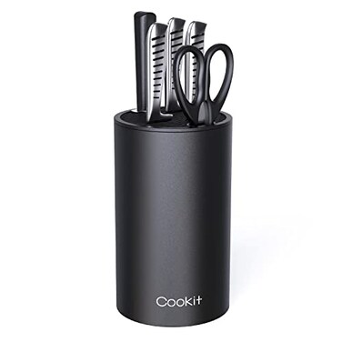 Featured in Cookit knife block holderCookit Universal Knife Holder Cookit knife block made of premium PP material, it can holds all up to 12 knives with 8? blades plus a pair of kitchen scissors or sharpener, save the space for your butcher block countertop!Unique Double-Layer Wavy Design: Which can ensures your kitchen knives slid in or pull out easily and protects them from abrasion. The parallel knife groove design protects the blade from scratching and prolongs the service life of the knife.Detachable: Removable cover placing it under running water which flows out of the inlet at the bottom.Package include: premium knife storage *1 (noted: without knives)