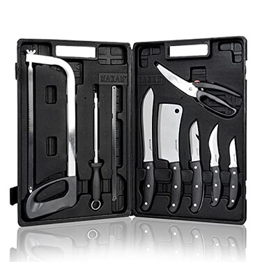 The Maxam 13 piece Game Processing Set with full tang stainless steel blades and triple rivet Leymar handles is the perfect kit for hunters and outdoorsmen. Once you've bagged that deer, elk or moose, you will be ready to field dress your kill with this complete set of tools specially designed to do the job. The Kit Includes 10 inch shears, hacksaw with 4 stainless steel saw blades, sharpening steel, 13 1/2 inch cleaver, 11 1/2 inch butcher knife, 9 1/2 inch skinning knife with gut hook, 8 1/4 inch caping knife, and a 7 inch paring knife. All of these quality tools are packed into a convenient and easy to transport blow molded case measuring 12 inch x 18 5/8 inch x 2 3/8 inch.