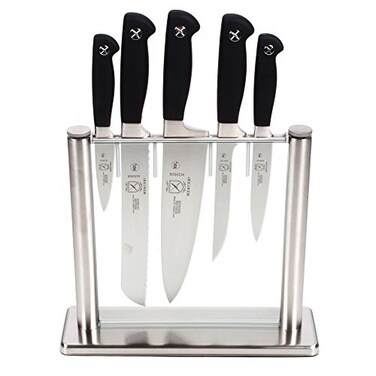 Amazon.com A supplier to the vast majority of cooking academies, Mercer Cutlery offers the Genesis Collection of kitchen knives to provide professional quality to the home chef. Comfortable, durable, and efficient, Genesis knives feature fully forged, single-piece blades made from high-carbon, no-stain German steel. Their taper-grind edges are polished by hand, and their substantial bolsters provide helpful balance. Black nonslip Santoprene handles make Genesis knives comfortable and secure in the grip, improving efficiency and safety in the kitchen. A handsome collection with a modern look, this 6-piece set includes five of the most popular Genesis knives and a striking tempered glass knife block. Designed to stand upright on the counter, the block holds the 3-1/2-inch paring, 5-inch utility, 8-inch chef's, 8-inch bread, and 6-inch boning knives. The knives are displayed as visibly as they would be on a magnetic strip but without exposed blades. All knives in this set are made in Taiwan using European components and technology. They should be washed by hand for best results and carries Mercer's one-year warranty. --Emily BedardWhat's in the Box 6-piece set includes five of the most popular Genesis knives and a tempered glass storage block. Knives included are: 3-1/2-inch paring, 5-inch utility, 8-inch chef's, 8-inch bread, and 6-inch boning knife. 6 items total. Product Description The best handle in forged cutlery. A perfect blend of modern technology and finely crafted German steel.