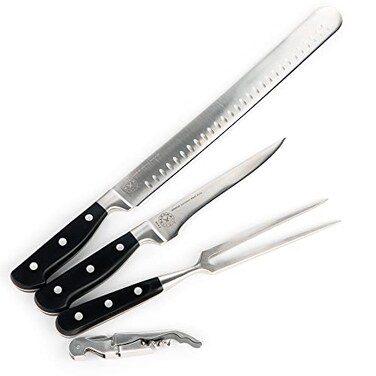 Introducing the SARUMA Carving Knife Collection: Every tool you need for the perfect cut.At SARUMA, we make preparing and serving food easy because we provide cookware that is durable, high quality, and ergonomic. We've designed our brisket carving utensils with simplicity and functionality in mind. All Purpose: Every barbecue grill set we make uses premium German stainless steel honed to a fine edge. Suitable for chopping, cutting, and slicing, the 12" dimpled knife for carving can be used on raw meat, vegetables, Fish or bread.Stylish: Each piece (12" Carving knife, 6.5" Boning knife, and Carving fork) boasts a sleek, minimalist look that will catch eyes and complement your other cooking utensils. The triple rivet and full-tang design further extends each piece?s quality and attractiveness.User Friendly: Each ergonomic knife handle is made with Super Hygienic molded polymer resin which is lightweight, sturdy, and gentle on your hands, yet it promises a firm grip to ensure precision when cutting.Rustproof, corrosion-resistant, and wear-resistant, this grilling kit with case promises years of enjoyment and entertainment.No matter where you cook--home kitchen, professional restaurant, catering--the SARUMA grilling accessories will keep you a cut above the rest.